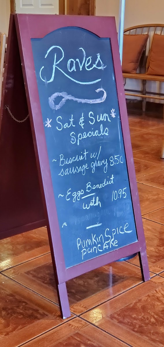 “ It was our first time at Raves today. We both had omelets, I had the ham and cheddar cheese, Barb had the veggie. These were awesome omelets! Service was excellent. The place is spotless. While they were kinda busy the omelets came out crazy quick!! We will be back to check out the French toast. ”